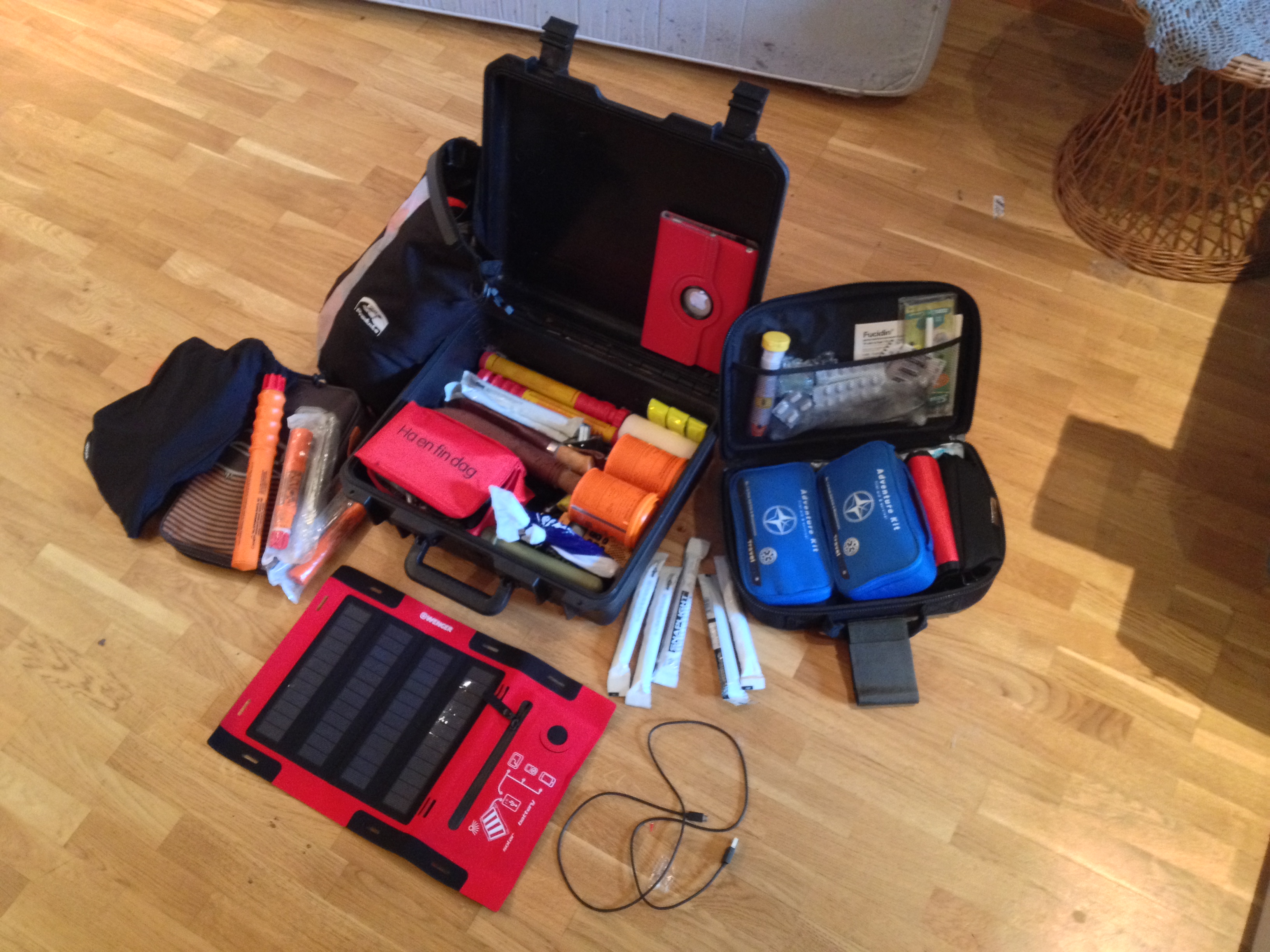 Nød/sikkerhet: UHF, VHF,  Nødbluss, Nødbluss med fallskjerm, Nød-Signalrøyk, Nødproviant Real, Nød-trelags tøy og sko pakke, Hodelykt, Lommelykt, Lightstiks, Stearinlys stort, Bjørneskremmer «snubletråd», CO2 Patroner, Ekstra GSM Telenor pakke, Ekstra GSM Netcom pakke, P – gass, H – gass-, Strips-. Vertøysett- Sykkel, Ekstra slange, Satcom, Stormlighter, Flintstein, Batteriepakker,GPS, Kart, Kompas-, El belte, Våpen og Ammunisjon (om nødvendig)