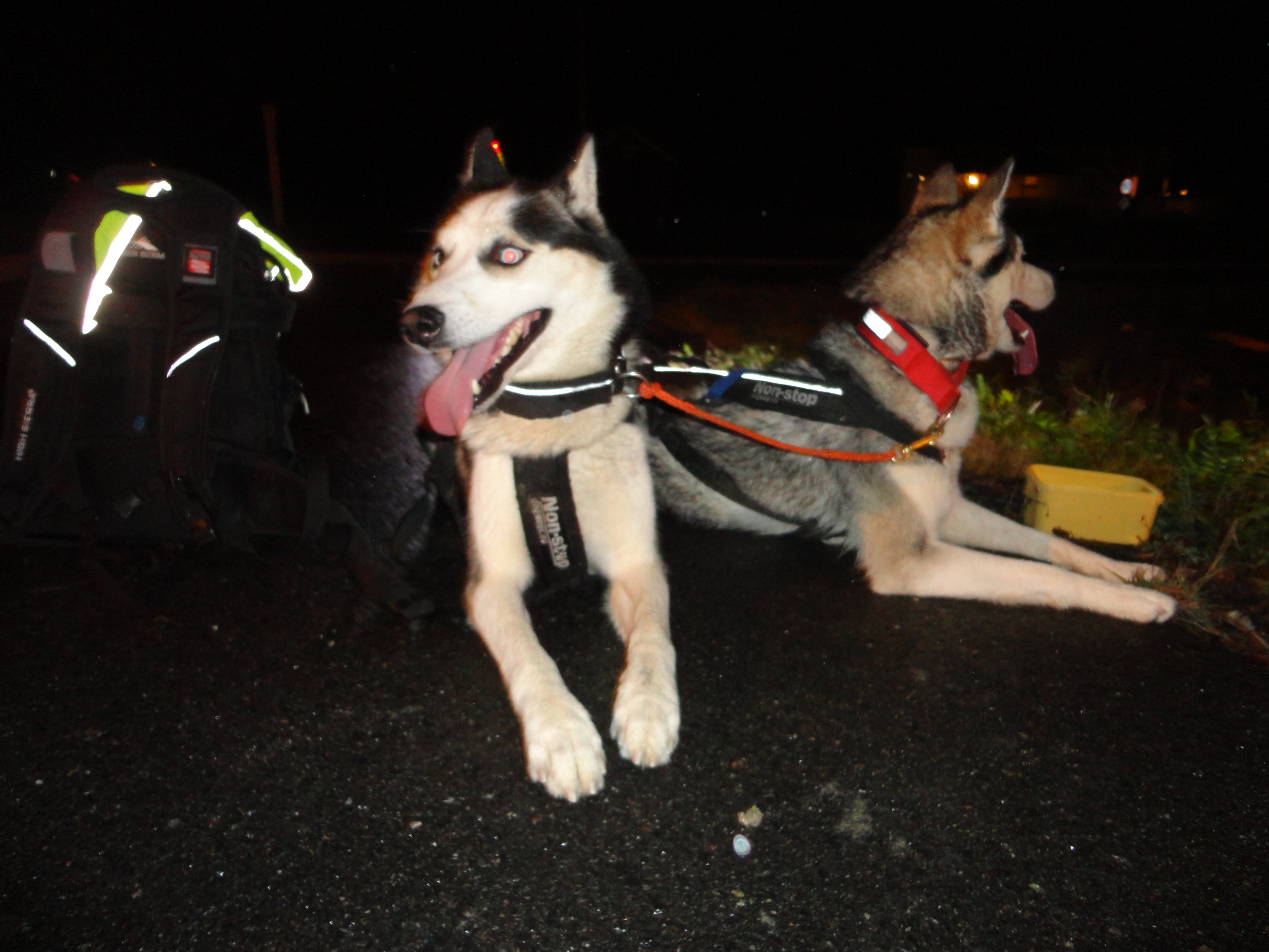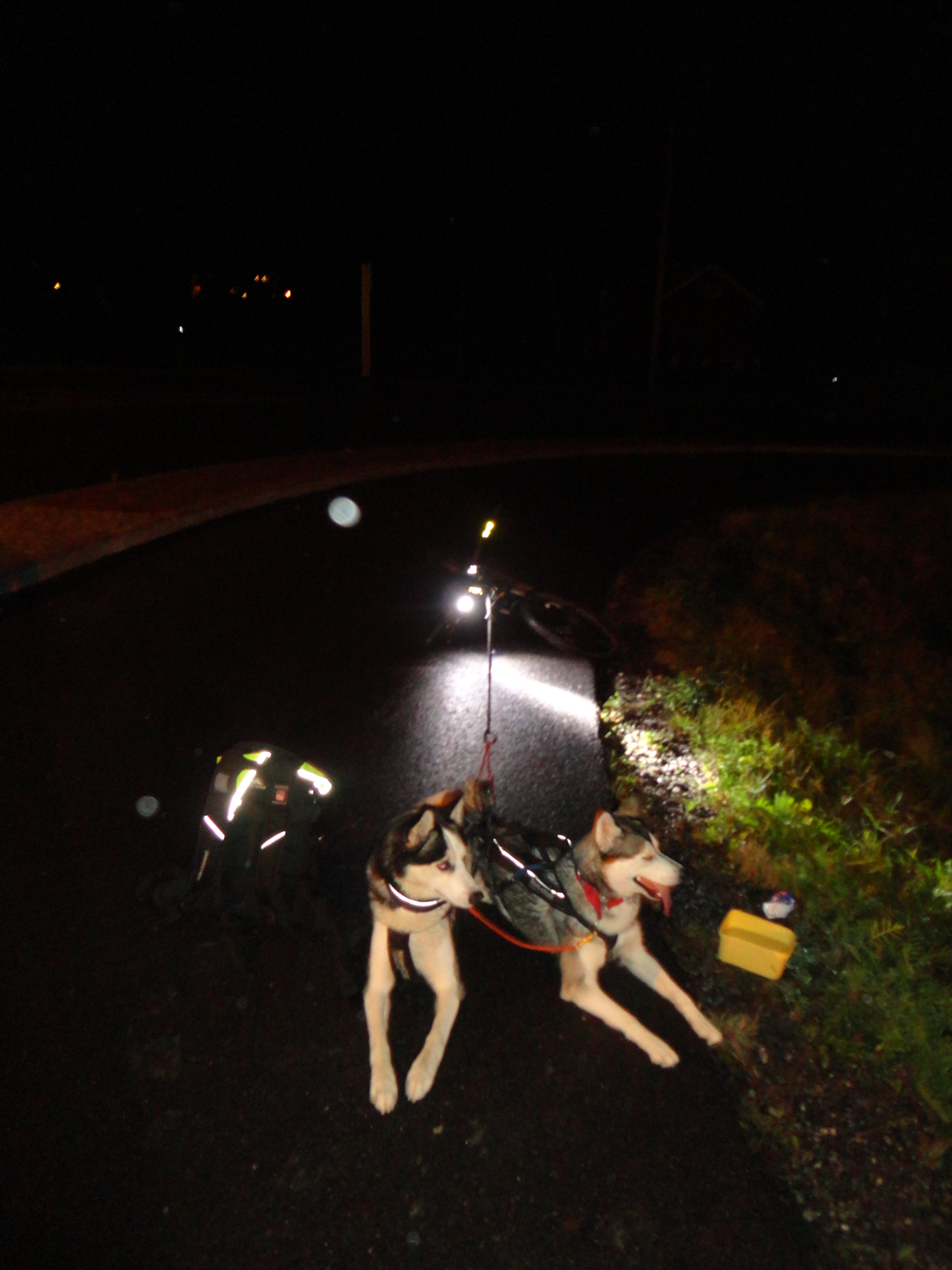 Fin økt i dag, vi testet en ny rute. Jeg hold igjen tempo og mye bremsing. Overskyet vær, med regn. Glatt og gjørmete. Måtte gå ca 500 i nedstigning. Vi hadde 3 drikkepauser, med 3 minutter pause. Passerte 5 hunder, dette gikk fint. Fikk også gående imøte, dette gikk også fint. I alt en flott treningsøkt, med god innsats av begge hunder.