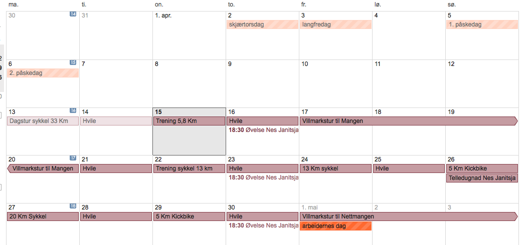 Her kommer månedens treningsplan. Vi benytter sykkel og kickbike. Vann pr 4 km. Har planlagt to kortere helgeturer med overnatting i lokalområdet. Oppvarming: 10 minutter lett løping.