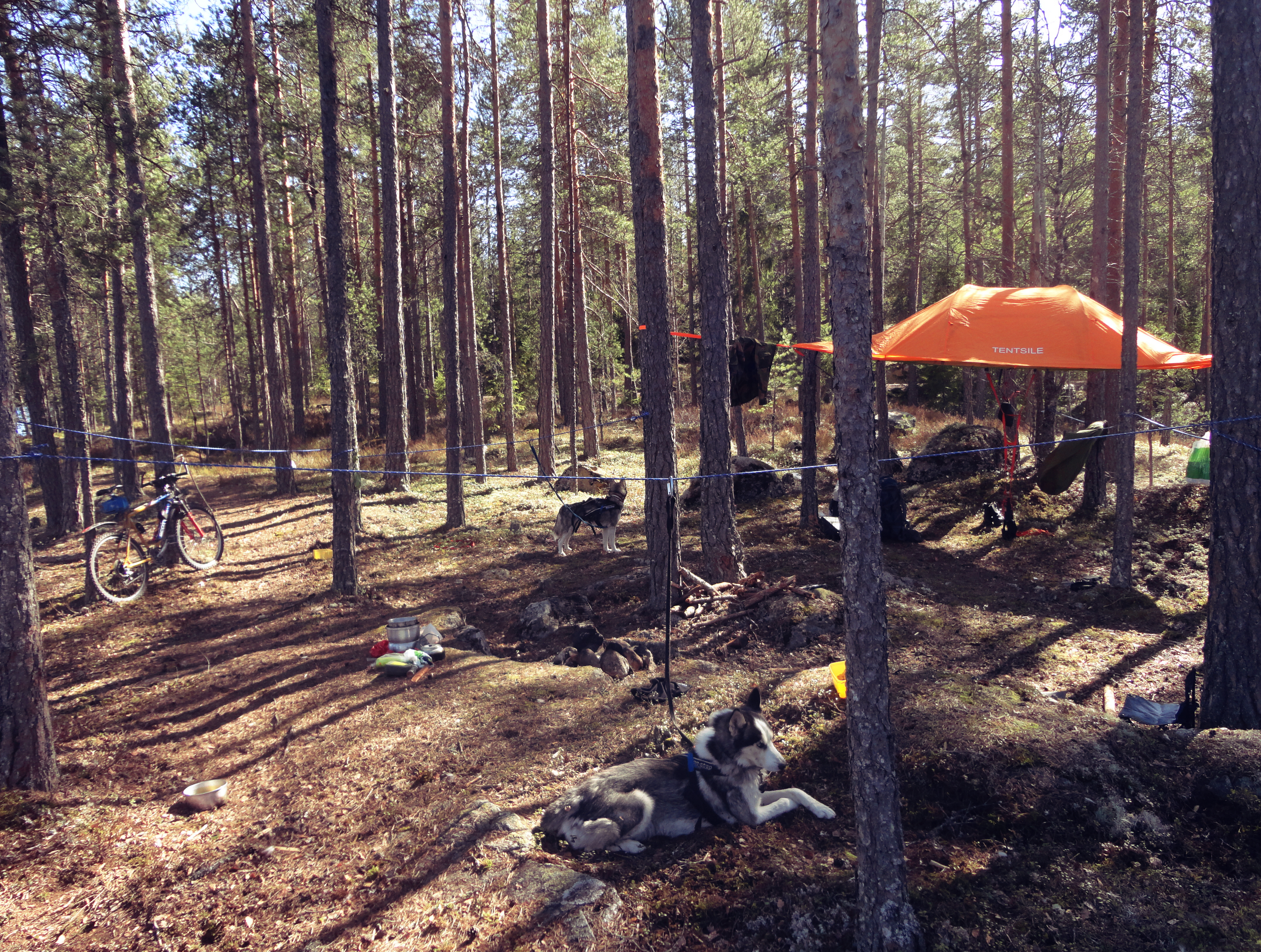 De gale har det godt 🙂 I morgen er det tilbake til sivilisasjonen så jeg valgte å beholde campen. Et utrolig fint sted dette her. Plassen ligger perfekt med le for vinden på alle sider og solen hele dagen. Masse ved til bålet og en perfekt bålplassen med naturlige vindskjerming. Både morgen og kveld er det masse elg og rådyr. I grålysningen i dag blåste det motvind så det tok lang tid før Misha så dyrene, for da forsvinner de fort. Fuglelivet er også rikt, alle de vanlige skogsfuglene viser seg fra sine aller beste sider. Endene er fremdeles skeptiske til oss, litt synd egentlig da jeg er glad i å mate disse. Men de frykter nok «ulvene» og de er ikke så vant med folk her inne, de kan nemlig ikke overleve på Nesbuene aleine, slik som Oslo mafian.