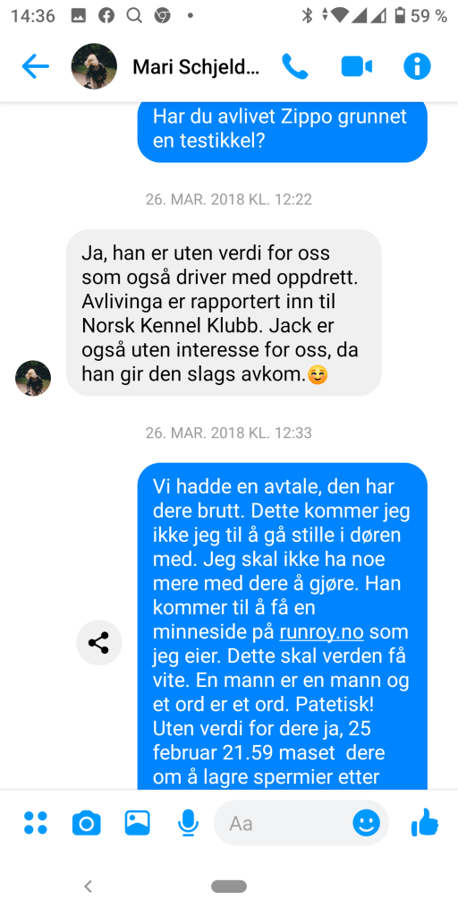 Jeg har jo hørt rykter om kennelen lenge og har trodd det er misunnelse og irritasjon over Roy Arne sin busete oppførsel. Jeg har forsvart kennelen og stått i dritten av lojalitet for oppdretteren av Misha. Det minste jeg nå kan gjøre er å fortelle verden om Zippo sitt korte liv, der han ble usatt for en utrolig kynismen om penger i kassa og latskapen ved å ikke ta ansvar for hundene man bringer inn i denne verden.