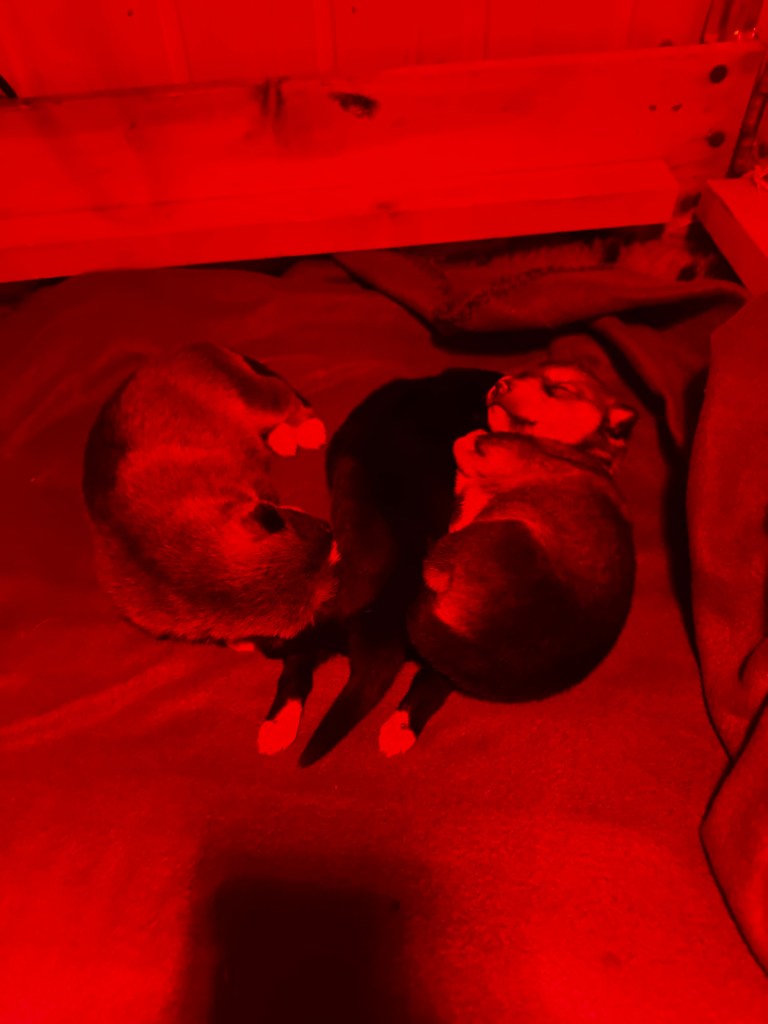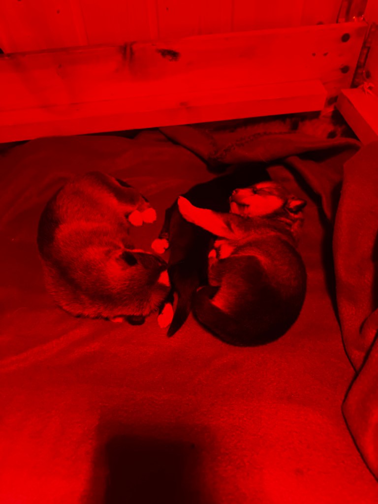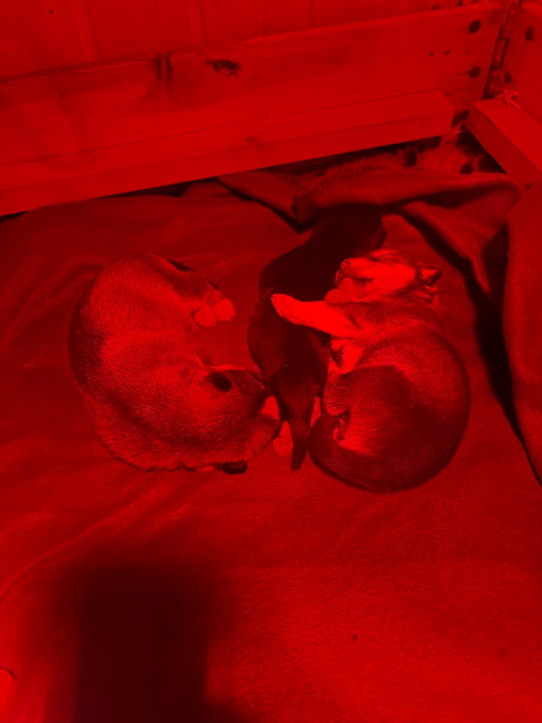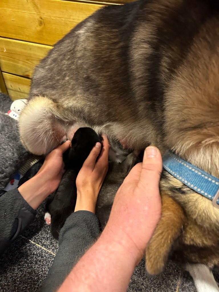 Etter dette så tar vi med oss tåke hjem. Hun skal få være sammen med søsknene sine. Vi låner to valper fra Naya og la de sammen med Tåke i egen valpekasse med varmelampe og varmematte og gjett om hun ble glad. Dette gjorde vi vi både for at Tåke skal føle nærhet og varme fra flokken sin, men også fordi vi ønsker at hun skal lukte det samme slik at vi kan legge henne sammen med mor og hun aksepterer Tåke igjen. Etter noen timer får Tåke amme fra mamma under streng kontroll fra oss og på dette tidspunktet avventer vi at de får kontakt utover at hun drikker melk.